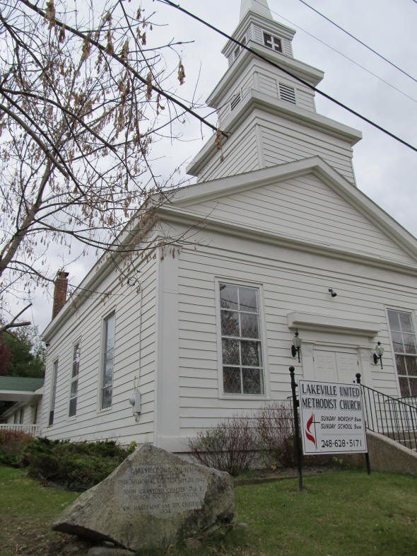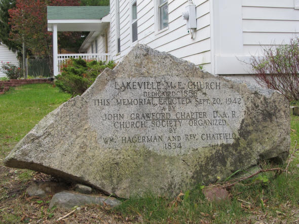 The Lakeville Methodist Church boulder was placed in 1942 on the church lawn (color photo of church and boulder above). It has recently been moved to the Lakeville Cemetery on Drahner Road, Addison Township, MI. The Lakeville Methodist Church was the oldest church in Oakland County, MI.